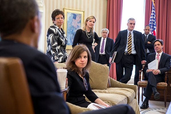 In this picture, Barack Obama pretends there are women who work at the White House. (Look, they even hired Mary Louise Parker to play a staffer.) That is so cute!