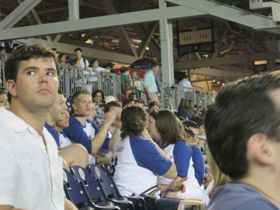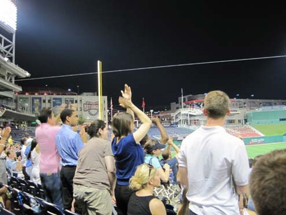 The stadium was split into sides, for Democrats and Republicans. We did not venture to the Republican side. Perhaps because Jim was afraid considering all the fun and racist comments he heard while sitting on that side last year? Or perhaps because it was far and we were too lazy to move after eating delicious Ben's chili dogs. Well, here we have Democratic staffers excited because a) a Democrat hit a ball or b) a Republican dropped a ball or c) their blackberries just informed them that the new deal was just reached on financial reform.