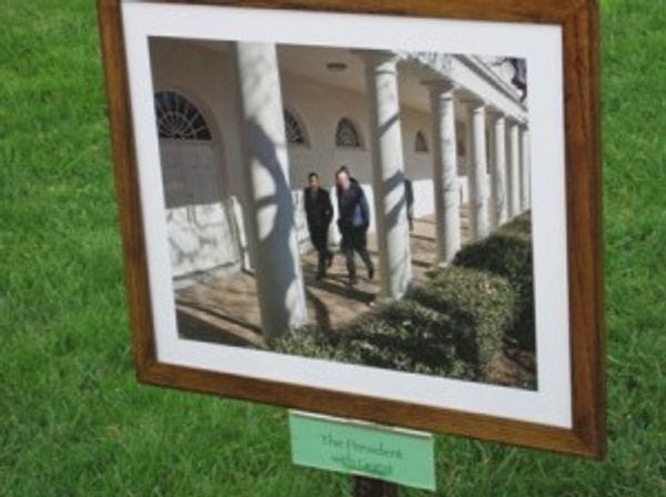 The caption reads: "The President with Guest." Special prize to whomever can figure out who the President is walking with, and no, we do not know why this is the *only* caption that hides the identity of the President's companion.