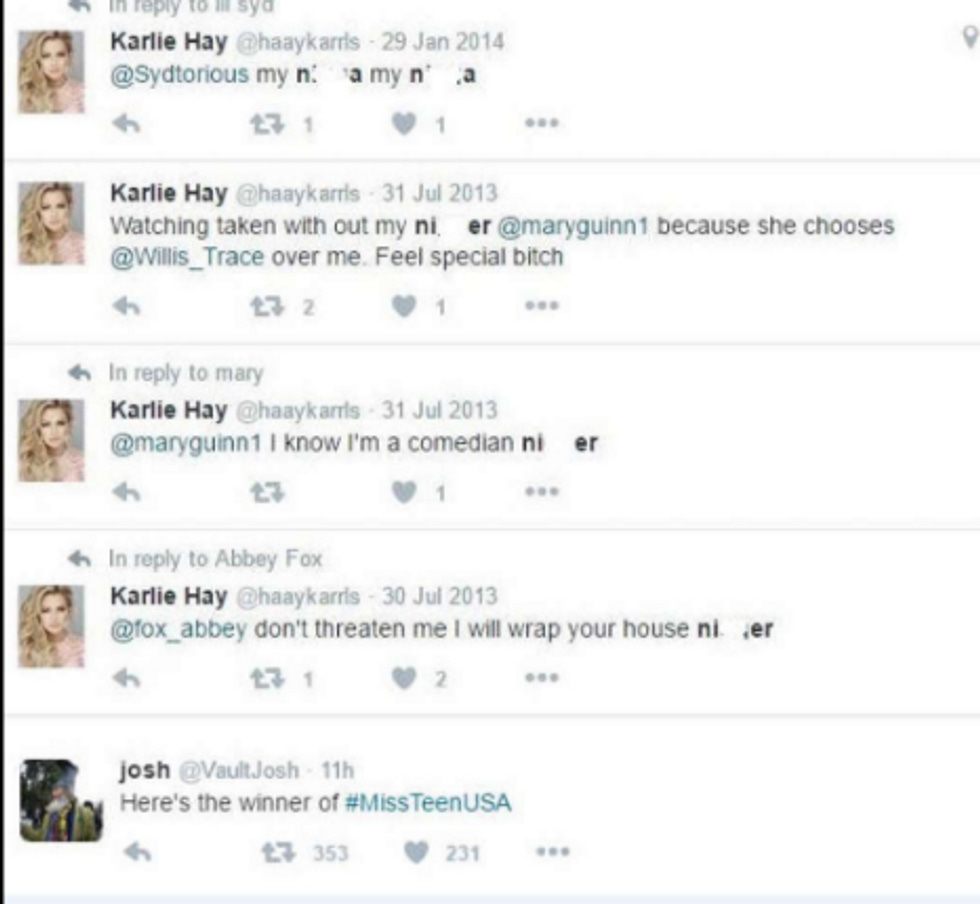 There she is, Miss Teen USA! There she is, your ideaaaaalllll ! Unless your "ideal" involves not being particularly predisposed to using racial slurs on the Twitter machine. If that is the case, 18-year-old Karlie Hay may not be your ideal after all. Alas!