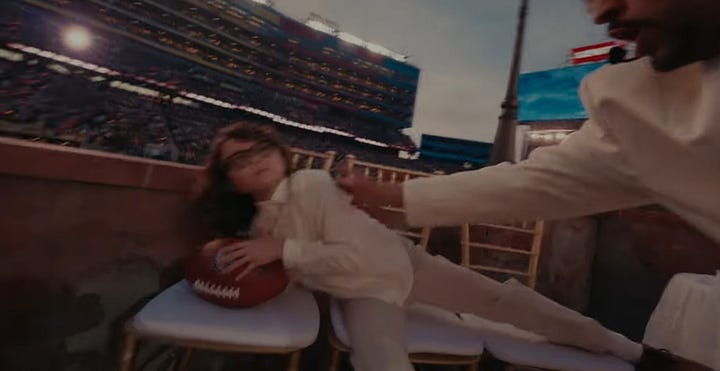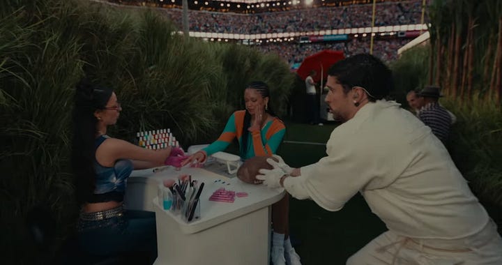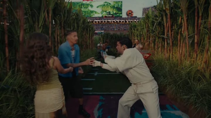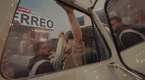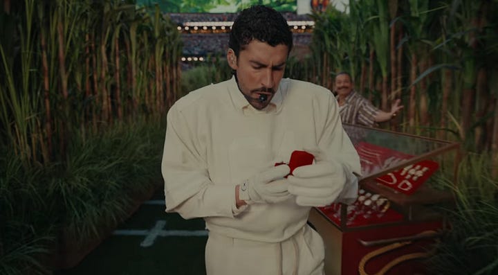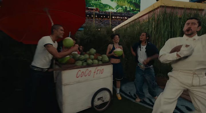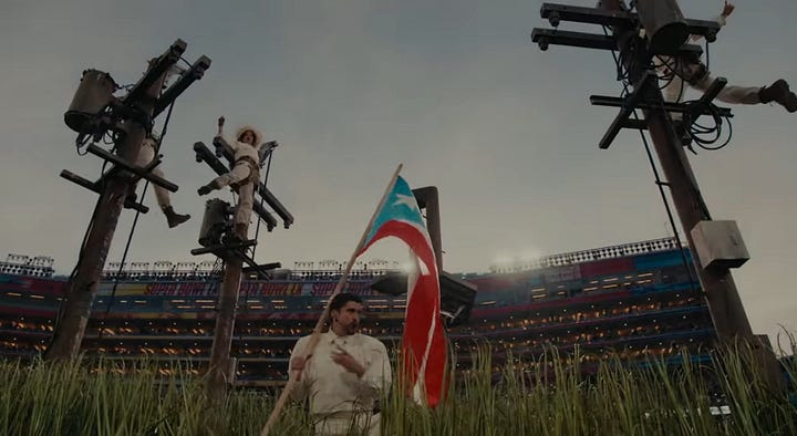 Bad Bunny, wearing an all-white jersey with number 64 (perhaps a subtle nod to Puerto Rico’s first peaceful transfer of power under its constitution in 1964) and his mother’s surname of Ocasio (respect to his matriarch) while holding a football “high and tight” (best position to not fumble), then moved on to a coco frio stand, which invokes a desire to maintain our traditions, in spite of the US importing brands and conglomerates to our island.