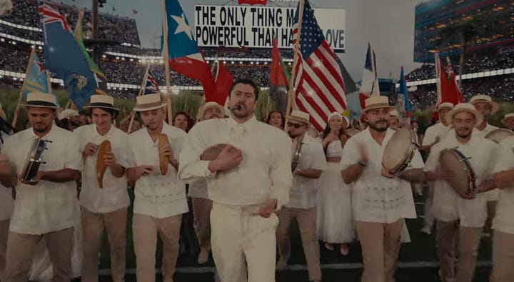 Bad Bunny began his grand finale performing “CAFé CON RON” (Coffee with Rum). As he descended the power lines, Benito yelled “God Bless America!” and proceeded to name all the countries that entails: Puerto Rico, Chile, Brazil, Colombia, Mexico, Canada, Nicaragua, Honduras, Cuba, Jamaica, Haiti, Dominican Republic and more, with a banner that said “The only thing stronger than hate is love” behind the parade of flags.