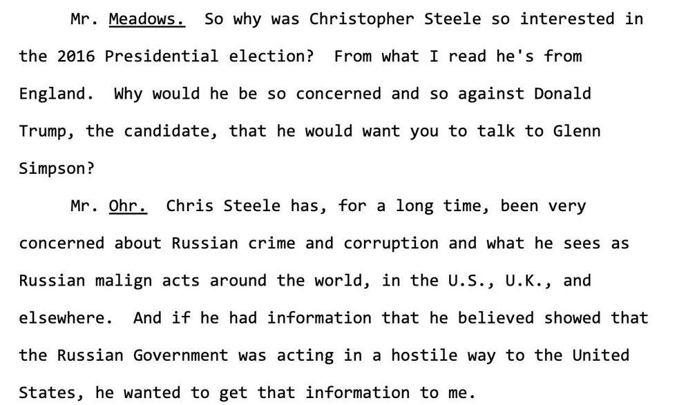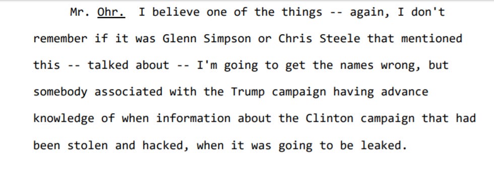 When Republicans left the closed-door meeting with Ohr -- that congressional testimony we mentioned above -- they started yapping to Trump TV that they sure heard some bad stuff, except for they pretended like they heard stuff that bolstered their Republican conspiracy theories about the FBI. In actuality, they heard stuff like this, when Ohr told them either Glenn Simpson (head of Fusion GPS) or Chris Steele had told him someone on the Trump campaign had criminal knowledge of the Russian hacking of the Democrats and their plans to release that information to hurt Hillary Clinton's campaign: