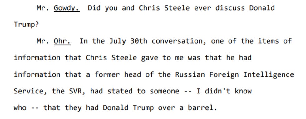 He told them about that time in late July of 2016, when Christopher Steele told him he had intel from "a former head of the Russian Foreign Intelligence Service, the SVR," who had told somebody the Russians "had Trump over a barrel."
