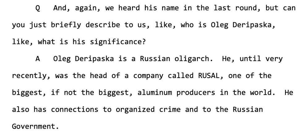 Oh yeah, and Ohr shared more details on exactly who this "Oleg Deripaska" really is, for those who haven't been paying attention and don't know why it's significant that Paul Manafort gave his old Russian spy buddy Konstantin Kilimnik internal Trump campaign polling data on August 2, 2016, and probably almost certainly intended that data to be delivered unto Deripaska: