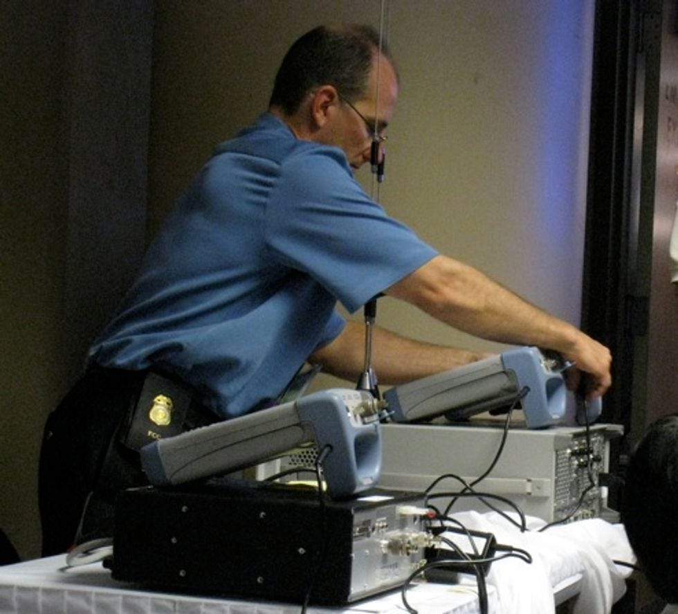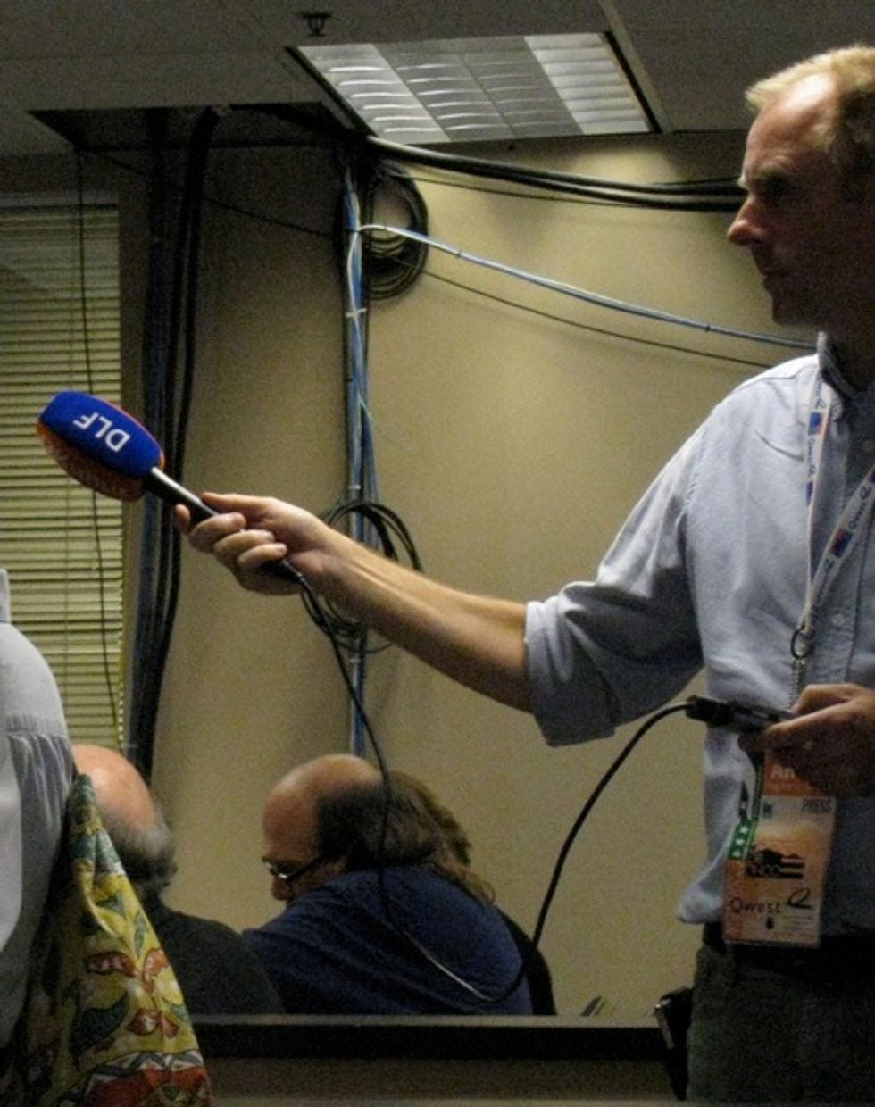 The press area -- or at least one of them, past all the fancy individual soundproofed rooms for the radio people -- smells like popcorn. Here you will find strange white men shooting death rays at the stage with these kitschy 50s looking wireless robots. Why do they hate America?