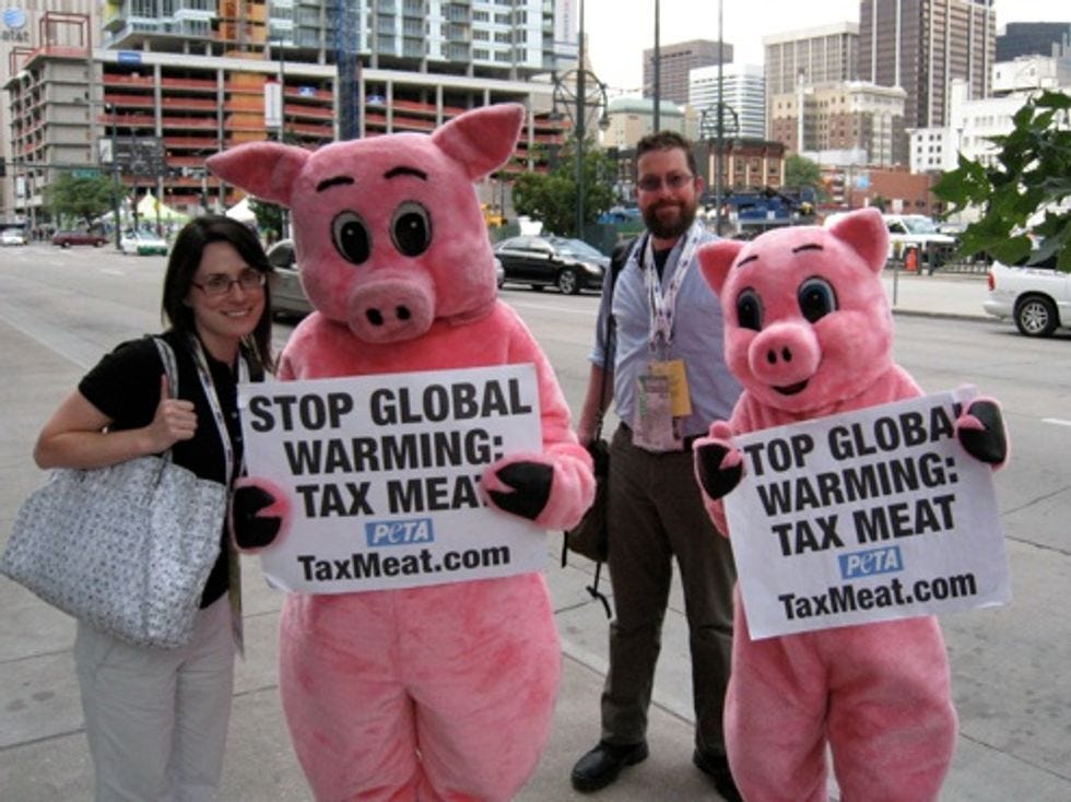 After this difficult day's work, your editors were forced to unwind with a hundred-dollar steak lunch, followed immediately by a photo op with these darling Peta protesters. "Stop global warming! Tax meat!"