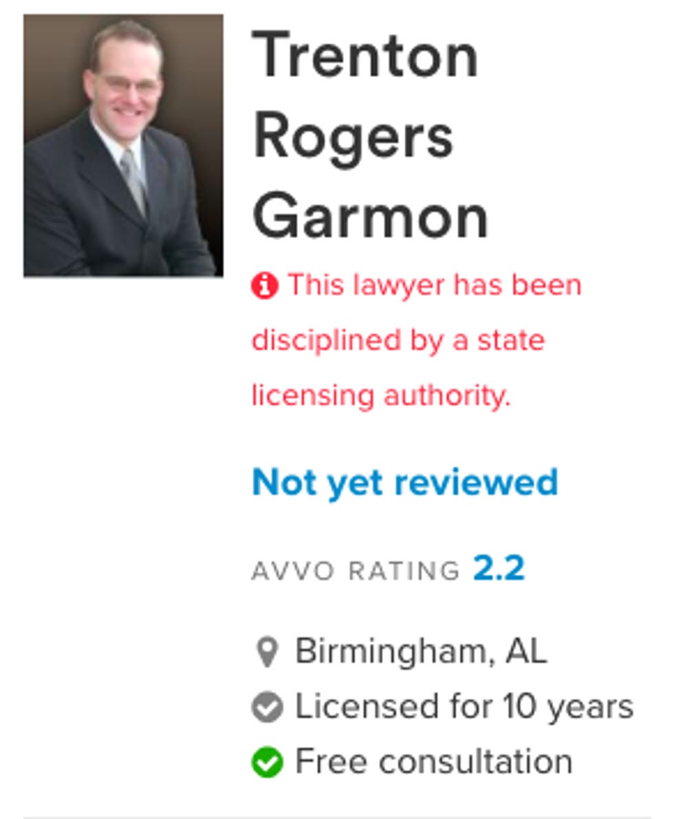 The Alabama Lawyer reports that Garmon had his license suspended for 91 days back in 2014. pic.twitter.com/TQQOTu3wfH