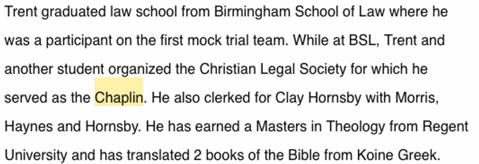 He seems nice. A fine lawyer, and a fine Christian. It's a damn shame that this guy's going to wind up sucked into the vortex of whatever horrorshow fireball engulfs Roy Moore and his campaign. Watch out Trent! The guy with the glasses is always the one that goes down first! (BUT NOT IN A GAY WAY, OF COURSE. Although, now that you mention it ... )
