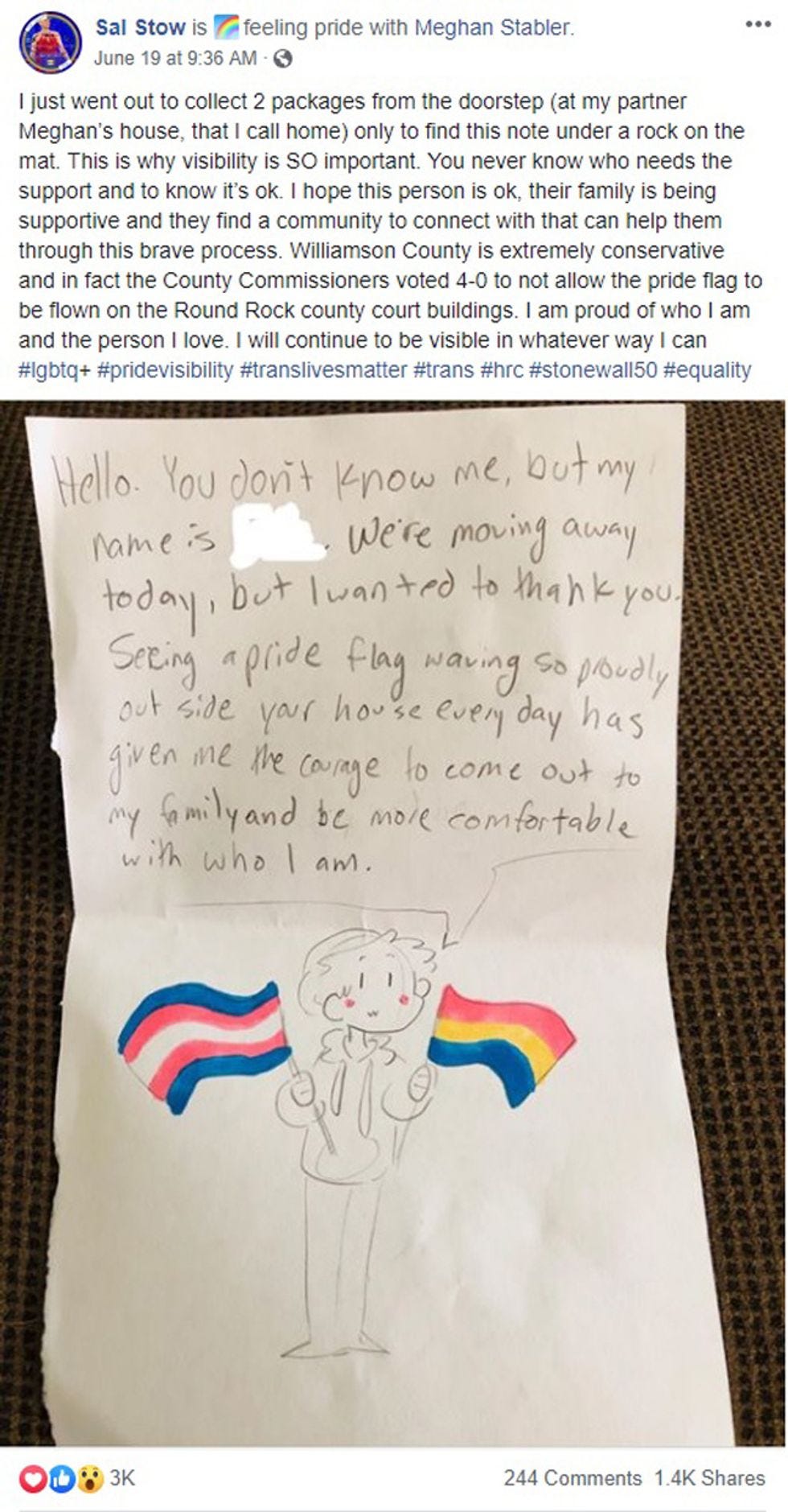 Also too this sweet story from Williamson County Texas, where bigots may run the county gummint, but a rainbow flag on a lesbian couple's home meant a hell of a lot to a local kid: