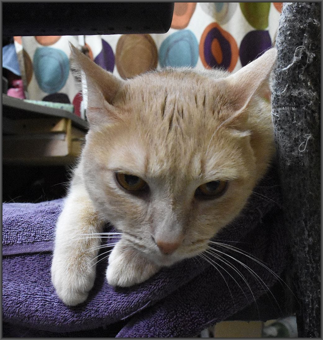 Now that the fighting neighbors are quiet, Simba came back down from the loft and now he's listening to the news and wondering if he should go back up into the loft.