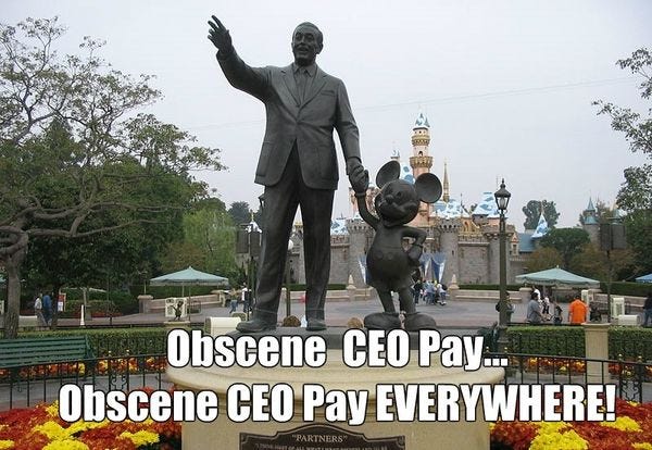 According to Equilar , Iger took home more than $65 million in 2018. That's 1,424 times the median pay of a Disney worker. To put that gap in context, in 1978 , the average CEO made about 30 times a typical worker's salary. Since 1978, CEO pay has grown by 937 percent, while the pay of an average worker grew just 11.2 percent.