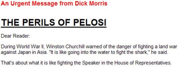 Toe-sucking prostitute-user and one-time Clintonista Dick Morris now spends his "work day" whining on Fox News about the mean Demoncraps, but he took some time off today to send us a very special email comparing Nancy Pelosi to Imperial Japan, OUR ENEMIES THE JAPS, during World War II. Why won't Nancy Pelosi denounce Imperial Japan for doing Pearl Harbor instead of kowtowing to the Japanese even today, because of sharks and health care and Winston Churchill? [Some Wingnut Group]