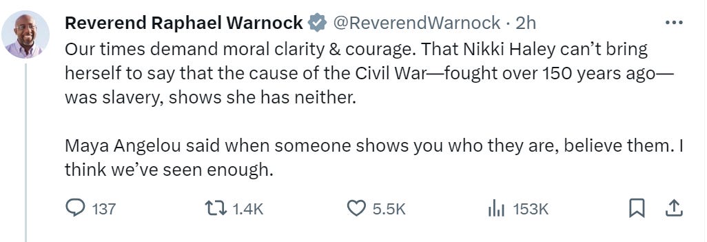 None of this holier-than-thou ranting obscures the fact that it does not matter if the person who asked the slavery question was a plant or not. The simple fact is, when offered the easiest of all layups, Haley couldn’t even hit the backboard. Because showing anything less than love for Confederates and their cause is how you lose GOP primaries nearly 159 years after the Civil War ended.