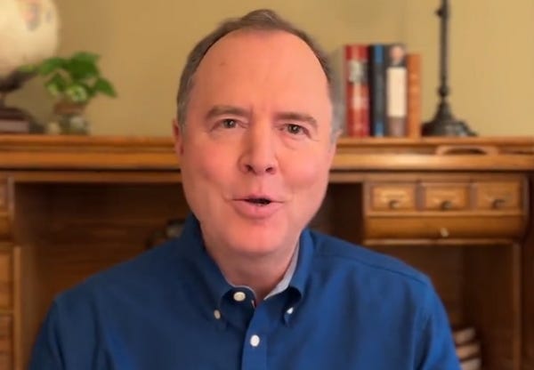 Earlier this year, little big man Speaker Kevin McCarthy kicked Schiff off the House Intelligence Committee for leading the first impeachment against Trump. McCarthy claimed there were other legitimate reasons, but he's a liar, and it was for nothing but spite, to punish Schiff for holding the GOP's traitor criminal lord and savior accountable. (He kicked Eric Swalwell off the committee for the same reason, though he lied and said it was because there were VERY BAD SECRETS involving Swalwell and a Chinese spy that he knew and we did not know. Swalwell was cleared by the FBI years ago, and the House Ethics Committee cleared him last month. McCarthy has strangely not profusely apologized for being such a clownfucking pube.)