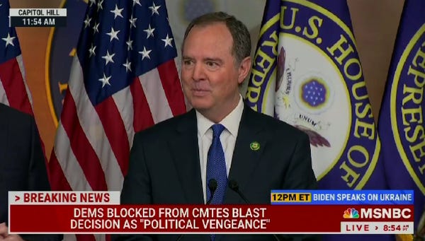“Schiff on McCarthy blocking him from the intelligence committee: "The cardinal sin appears to be that I led the impeachment of his master in Mar-a-Lago."”