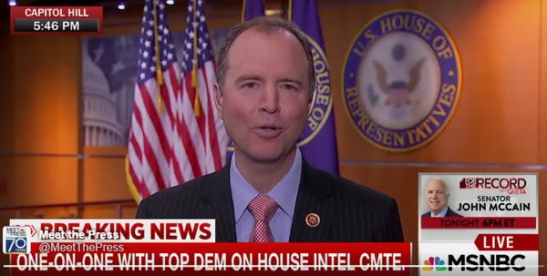 Uh oh, are Devin Nunes's dumb days as the dumb chair of the House Intelligence Committee over? Probably not, but his counterpart on the committee, Democratic ranking member Adam Schiff, has officially had it with Nunes running to the White House with a dead mouse in his mouth and a fresh turd in his hand every time he finds something (ANYTHING!) that mightexoneratedistract from the investigation into whether his big daddy Donald Trump or Trump's inner circle might have done a wee spot of high treason with Russia's help.