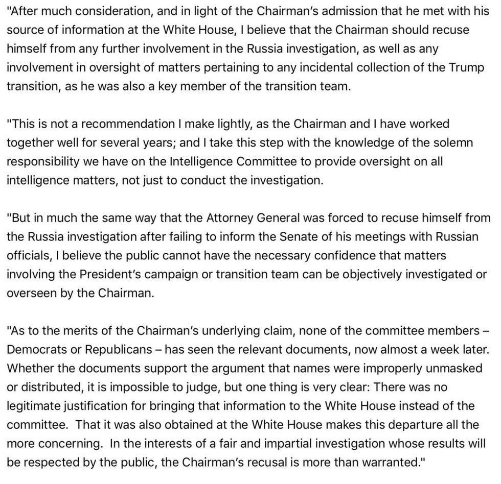 Do we need to transcribe that whole thing? Nah, you lose, don't feel like it. Basically it says that because Nunes is meeting his sources at the White House in the dead of night wearing a platinum blonde wig and no panties, allegedly, and then refusing to share his "secret information" with any of the members of his own intelligence committee, then for the public to be able to have faith in the investigation, Nunes needs to recuse himself, just like Attorney General Jeff Sessions did, after it was revealed he lied about meeting with the Russian ambassador. (We don't know whether Jeff Sessions was wearing panties when he had those meetings, but now you're thinking about it, HAHA.)