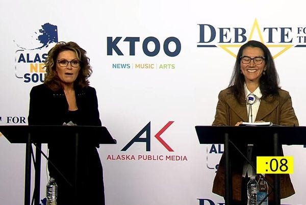 The debate last night gave Peltola the chance to stand out as a solidly moderate reddish-purple-state Democrat, an important consideration in a state that went to Donald Trump by 10 points in 2020. And the debate featured a lot of talk about the candidates' willingness to cooperate, even though it was downright bizarre hearing Sarah Goddamn Palin condemning the "politics of personal destruction" — not that she meant it.