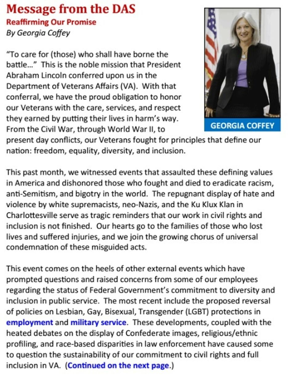 A statement from VA leaders was necessary, Coffey wrote in one email to Ullyot, because the agency's workforce was unsettled by the uproar caused by the Charlottesville violence. Minorities make up more than 40 percent of VA's 380,000 employees, the federal government's second-largest agency.
