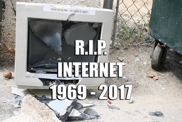 Today, Ajit Pai, the former Verizon lawyer picked by Trump to run the FCC, killed net neutrality. Pai said that after receiving millions of comments from consumers and talking to small businesses, he's confident that allowing corporations to control access to the Internet is a good idea. Advocates for repealing net neutrality call this a "light-touch" regulatory approach, because they are stupid.