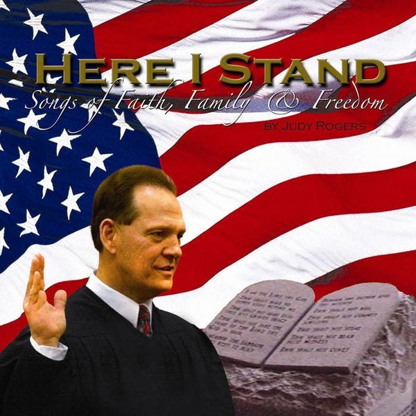 OK, so if you didn't know that happened, now you know. Let's get to the point of this post, which is that a crazy Christian singing lady called Judy Rogers has written a sexxx song for Roy Moore called "Here I Stand," which features the fucksquat judge speaking right in the middle of it, and it's about a bunch of fundamentalist Christian holy warrior victim complex bullshit, can you even believe that? Moore's wife Kayla posted it on her Facebook! Don't you want to hear it, so you can learn to stand up, stand up for Jesus the way Roy Moore does?