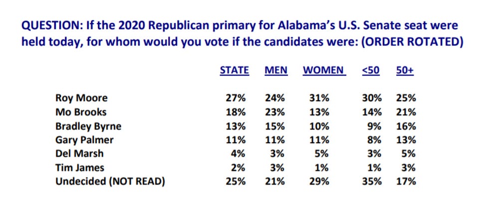 Now there is good news and there is bad news. The bad news is that it's really early, and Alabama Republicans' affections might turn toward a less chickenfucking insane candidate once the campaign gets in full swing. Does anybody seriously think the current rankings in the Democratic primary are actually how things will shake out? Nah. So there's that. And that would be bad news for Doug Jones because Alabama is still blood red and ... yeah.