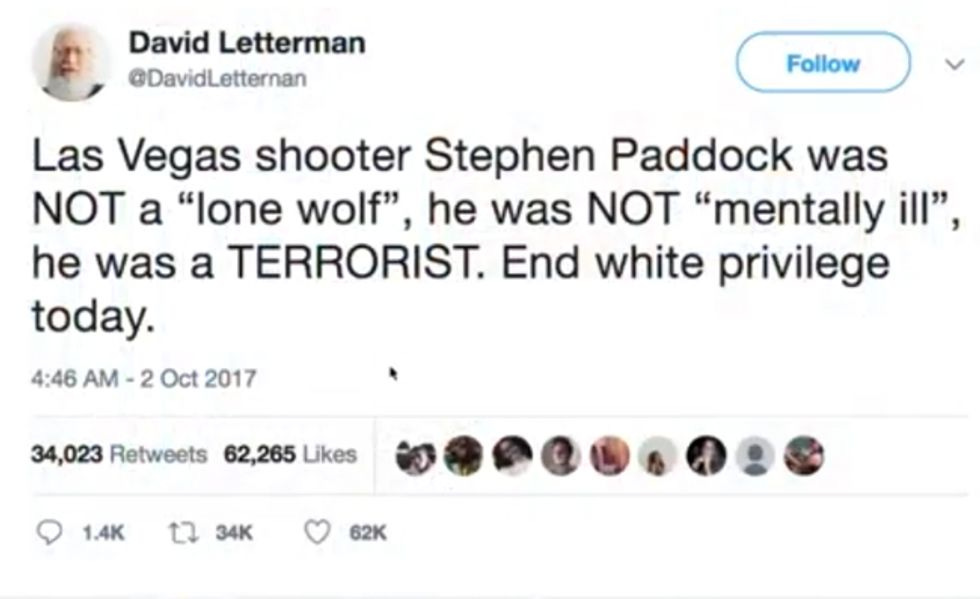 We looked at David Letterman's website this morning, and he blamed it on, essentially said, "We've got to stop White Privilege." This is falling right into the divisive narrative to split the United States in two, and I think probably foment a civil war, to destroy the U.S.'s unity. So this whole thing, Alex, is so strange.