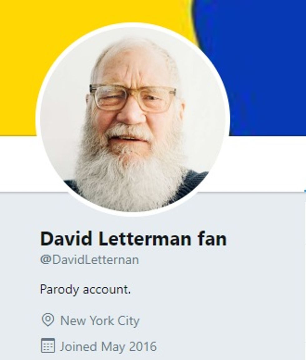 Since the Jones story, the person behind the account -- which says "Parody account" right on the main page, although it's not funny and doesn't sound even slightly like Letterman -- has swapped the display name. For a while Monday, it was "David Letteman not," which definitely made Jones look silly: