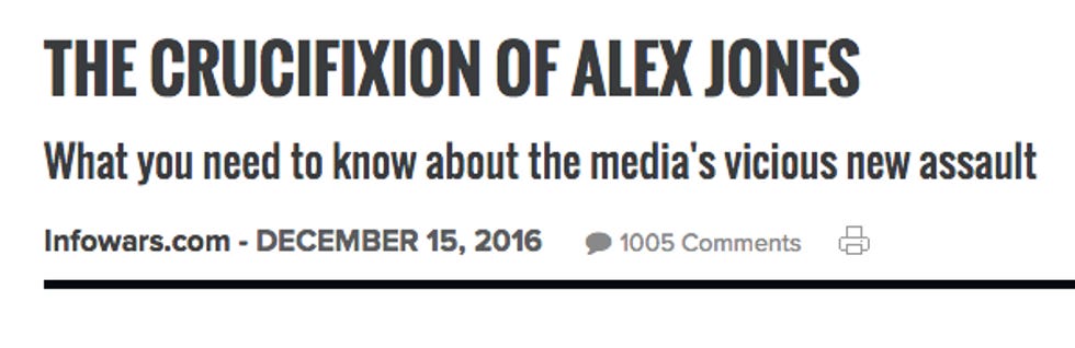 Alex Jones has, of course, been on the very forefront of this movement against the movement against fake news. He has even gone so far as to create his own list of "fake news" sites, which includes all of the places that publish real news (like Wonkette!) instead of weird rants about gay frogs .