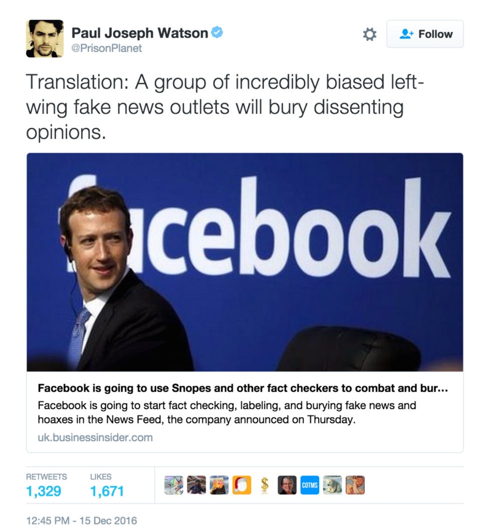 The problem with the proliferation of fake news, honestly, has a lot to do with the way Facebook decides what should go in your news feed to begin with. When a site publishes an article, and a bunch of people who see it click on it and engage with it when they see it (liking, commenting), Facebook deems that article as important enough to show other people. If that doesn't happen, it kind of disappears. Websites like Infowars publish inflammatory articles that make people go "Woah, what's that about?" and then go ahead and click on it immediately. Even people who may later say "Oh, that's some bullshit." But the fact that they click on it in the first place means that Facebook is going to show it to more people who may not go "Oh, that's some bullshit."