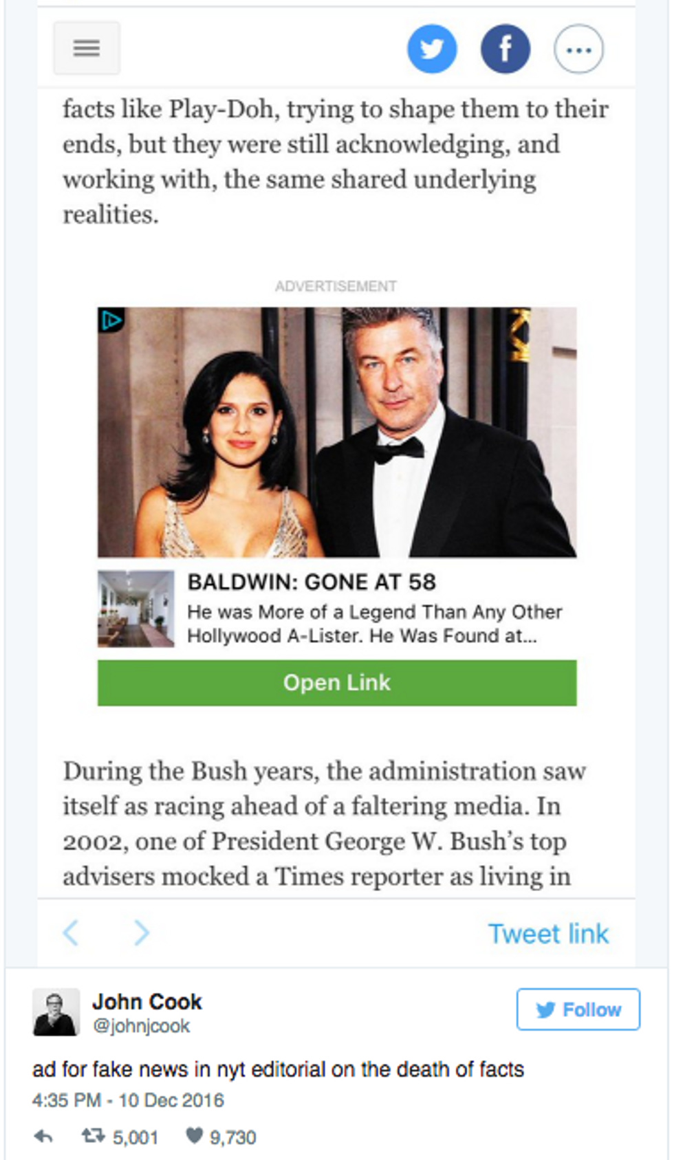 In explaining why The New York Times is fake news, Jones cites a recent incident in which an ad for a fake news story claiming Alec Baldwin died ironically popped up as an ad in a New York Times story about fake news.