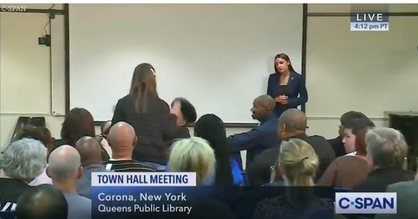 A visibly disturbed woman crashed Rep. Alexandria Ocasio-Cortez's town hall yesterday at the Queens Public Library. The supposed constituent declared during the question-and-answer session that Krypton was doomed (not really) and only the most extreme options remained for mankind's survival.