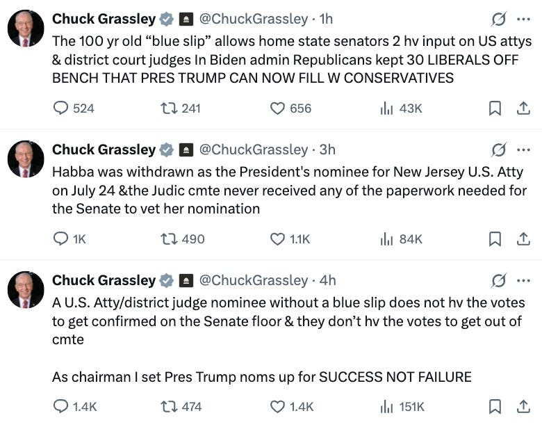 But Chuck Grassley says that Habba did not fill out her paperwork, OOPS! And also, by the way, she didn’t have the votes to get out of Committee. (Er, which is it?)