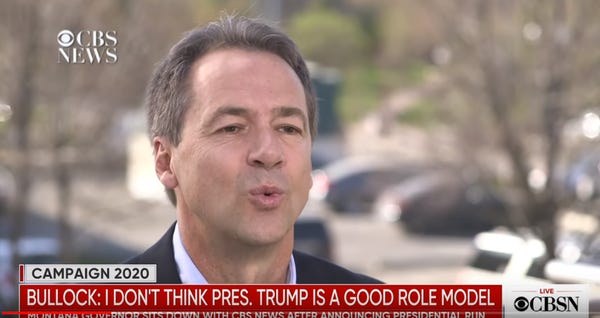 But, of course, there are a handful of people who didn't qualify for any of it, and one of them in particular will not stop bitching about it. We are talking about Montana GovernorJim J.Steve Bullock (see? we don't even know what his fucking name is), who Johnny-Come-Lately-ed into the party and now he's mad that he didn't qualify under the rules every other candidate had to play by . He is saying "whine" about how he's a really popular governor who won in a Trump state (true!) and "whine!" the polls wuz #rigged (yeah nope) and "WHINE!" he didn't have time to run for president because he was protecting Medicaid expansion in Montana's batshit legislative session (awesome!) and therefore it's NO FAIR that he doesn't get to debate.