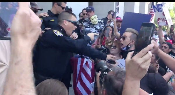 Last year, Sacramento, California, police arrested 84 people during a protest over the district attorney's decision not to file charges against two officers who shot and killed Stephon Clark, an unarmed 22-year-old black man. Friday, there was a #FullyOpenCalifornia rally in at the capitol in Sacramento, with a motley crew of infectious stupidity. They shouted, “U-S-A!" and “Open up!" while waving around coronavirus-tainted American flags.
