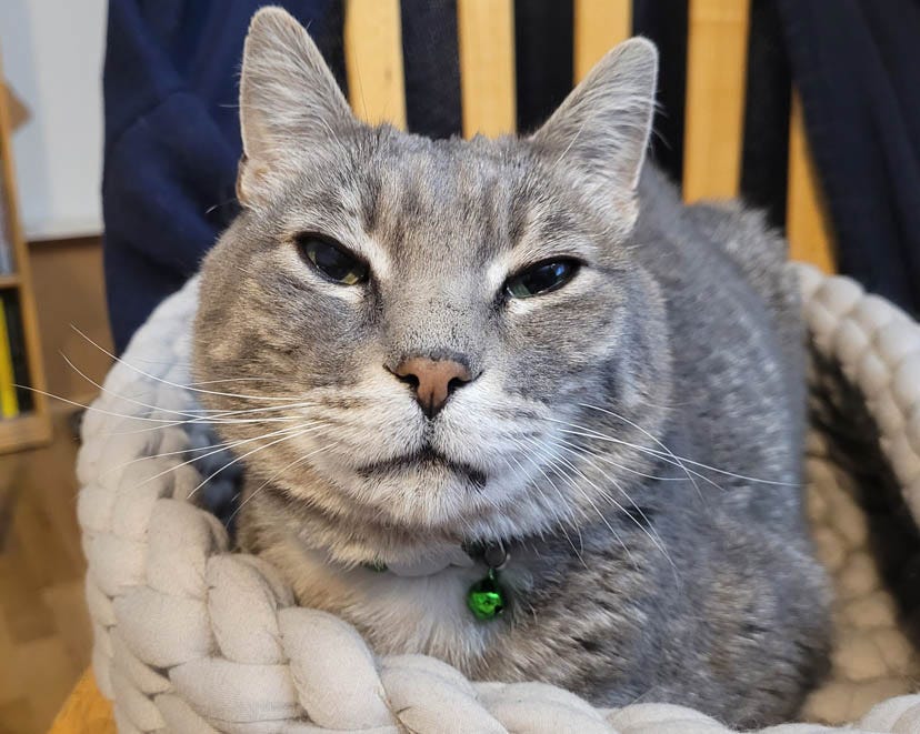 Aww, sleepy, handsome Thornton. My sleepy, happy friend Mittens says hello (or he would, if not sleeping).