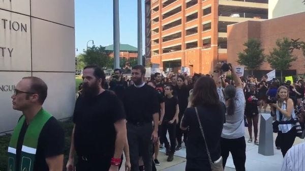 Walking in to sheriffs office to collectively turn ourselves to say: targeting racial justice organizers? arrest me too! pic.twitter.com/YtTTDEQv20