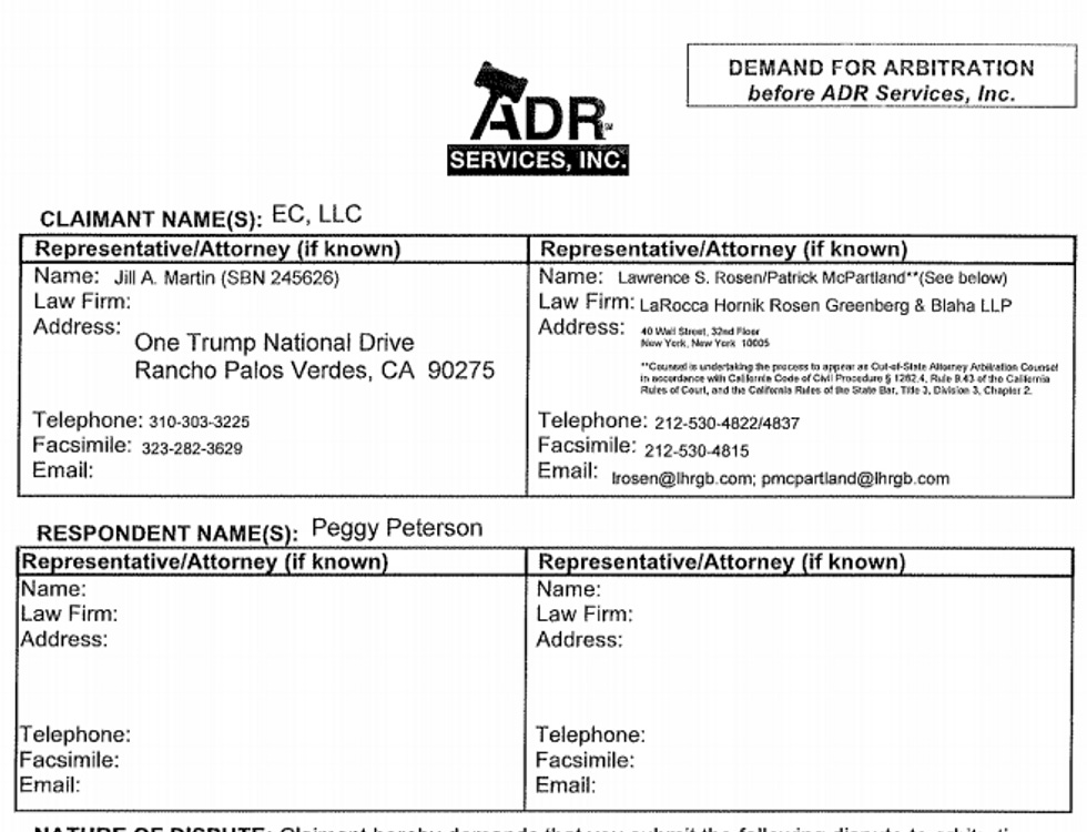 Hey, Jill Martin! Hope you didn't draft that Demand for Arbitration using your Trump Org laptop while sitting in your office at Trump's LA Golf Club overlooking the 7th hole. That would be awkward! Don't worry, though. When Michael Avenatti asks you about it in a deposition, just shout SAYS WHO? over and over. It's working out great for your buddy Michael Cohen.