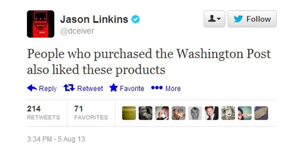 Please feel free to fill the comments with speculation about how the paper may be influenced by Bezos's personal political views, which lean libertarian, at least according to Reason and to early Amazon investor Nick Hannauer, who is the sort of rich guy we'd rather see running a major paper, if such a thing even exists anymore. (Ha-ha! Your medium is dying!)