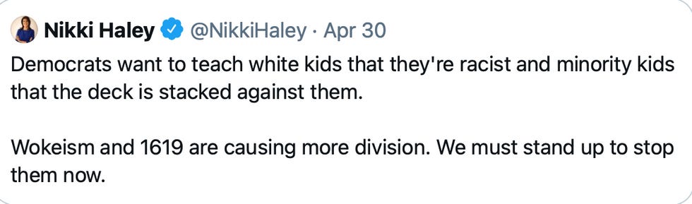 Former South Carolina GOP Governor Nikki Haley snidely tweeted Friday: "Democrats want to teach white kids that they're racist and minority kids that the deck is stacked against them. Wokeism and 1619 are causing more division. We must stand up to stop them now."