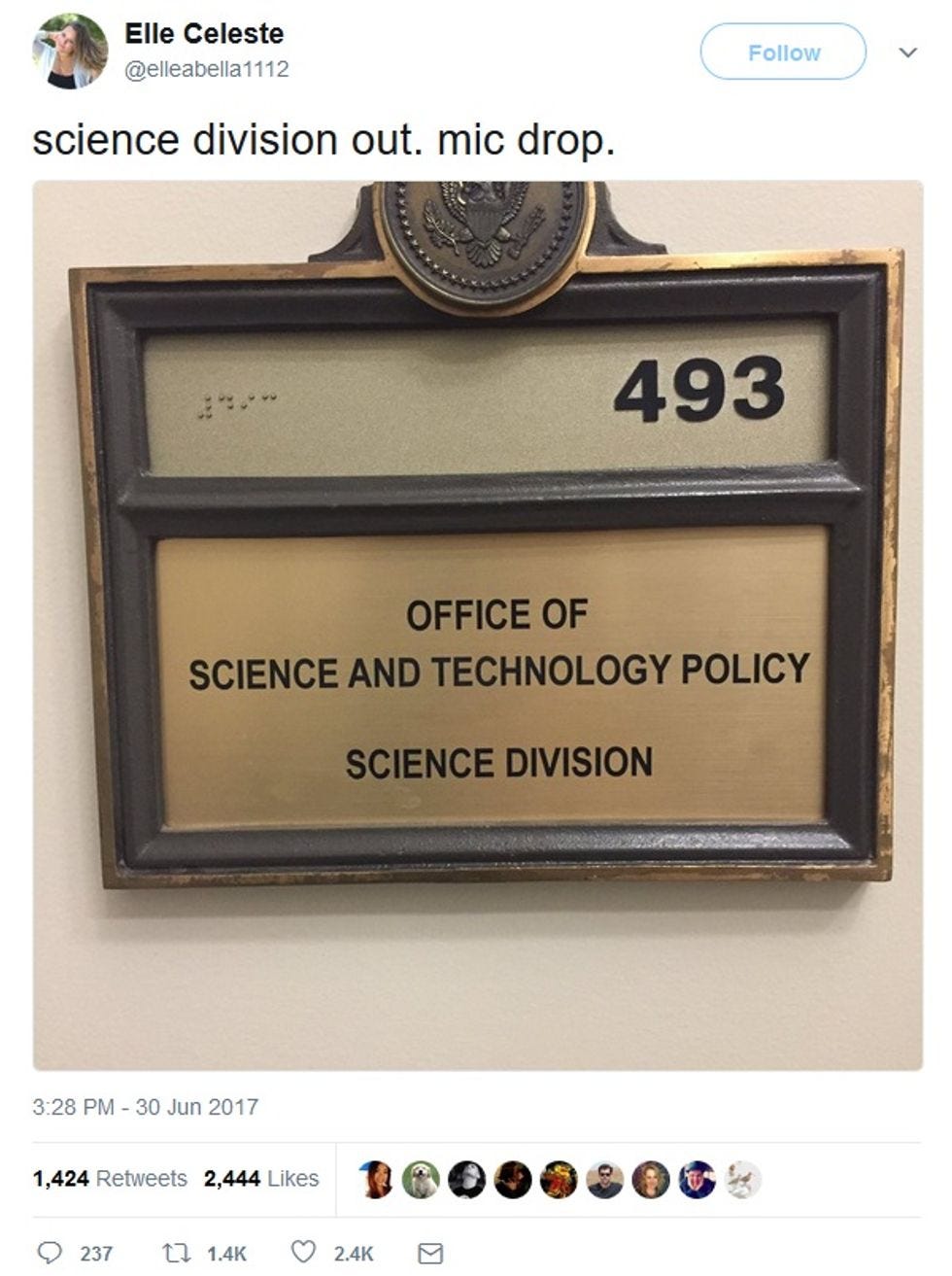 Time for another fun Trump Administration Science Roundup! Since it's about the Trump administration and science, it will of necessity be brief. For starters, there's this shocker: The science division of the White House's Office of Science and Technology Policy (OSTP) now has zero (0) staff, which is down from nine full-time staffers during the Obama administration. The last three holdovers from the Obama years left their jobs Friday and locked up the office, which will now presumably be used to store coal. Here's now-former assistant director for biomedical and forensic sciences Eleanor Celeste's farewell tweet: