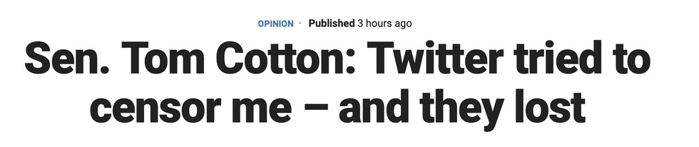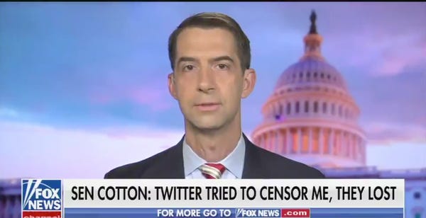 Cotton describes this clash of the titans between himself and a "low-level" Twitter employee in a Fox News op-ed. This is the actual headline, we swear: