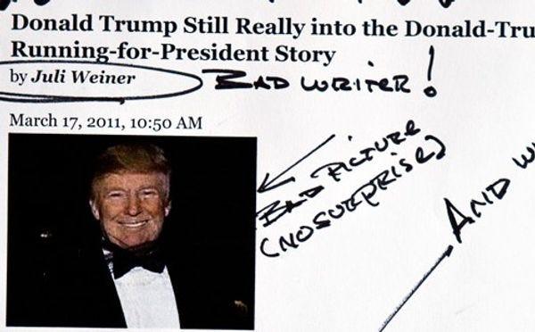 Anyway, Donald Trump is ANGRY about this Juli Weiner writing these magazine articles that are actually blog posts printed out, so Donald Trump can figure out how to look at them. Juli writes at VF Daily: