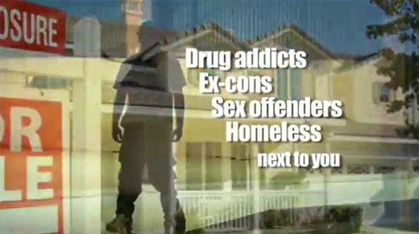 The New Jersey legislature is pushing a bill that "would establish a temporary agency, the New Jersey Foreclosure Relief Corp.," which "would acquire houses in foreclosure and make them available to towns, non-profit groups, or private investors as low- and moderate-income housing." The corporation would be similar to the RTC, which helped clean up the mess left behind by the savings and loans crisis; and this proposal has the backing of the "state League of Municipalities, the New Jersey Builders Association, the Housing and Community Development Network of New Jersey, the New Jersey Bankers Association, and other groups not often found lined up together." Sounds good. What's the problem? There isn't one... but according to this lovely ad from Dave & Chuck Kochs' Americans for Prosperity, this bill will FORCE DRUG ADDICTS, EX-CONS, SEX OFFENDERS AND HOMELESS MONSTERS INTO YOUR NEIGHBOR'S HOUSE, TO KILL YOU.