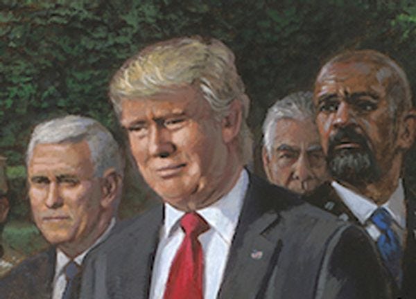 The new work, "You Are Not Forgotten," doesn't have any interactive annotations, and with the exceptions of Mike Pence, Donald Trump, Rex Tillerson, and Insane Milwaukee County Sheriff David Clarke, the figures all appear to be generic stand-ins for Real Americans: Cops, Soldiers, a black lady Gold Star Mother, a saluting Marine, Veterans, Biker Veterans, a Wheelchair Veteran, an Amputee Veteran with a Veteran Service Dog, and all the other kinds of Veterans that make up the rich tapestry of American life. They are carefully reproduced from stock photos, or people Jon McNaughton knows, we guess. Also, NO MUSLIMS.