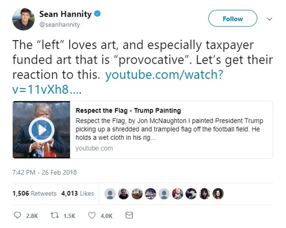 Sean Hannity, who actually bought Donald Trump his very own McNaughton print ("Obama Steps on the Constitution Etc.") the week after the election, tweeted out McNaughton's new video Monday with a challenge to "The Left": Love this provocative art or admit you are a big elitist hypocrite, you!