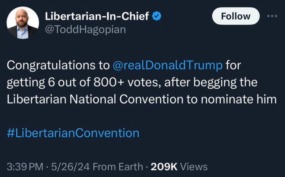 “Keep getting your three percent every four years,” Trump disdainfully told the Libertarian audience he earlier asked to support him. Libertarians haven’t shied away from continuing to tell Trump to fuck off.