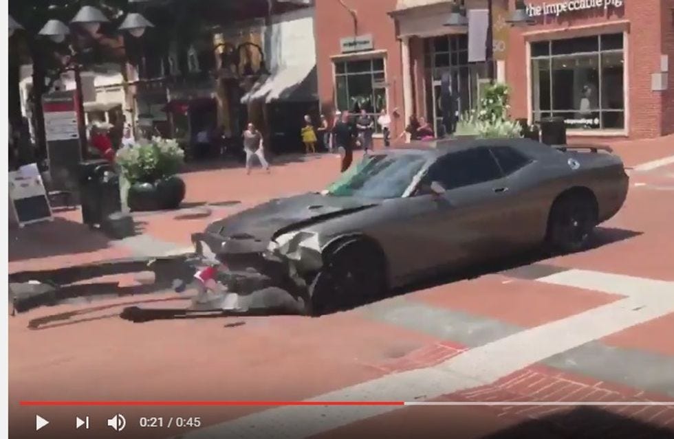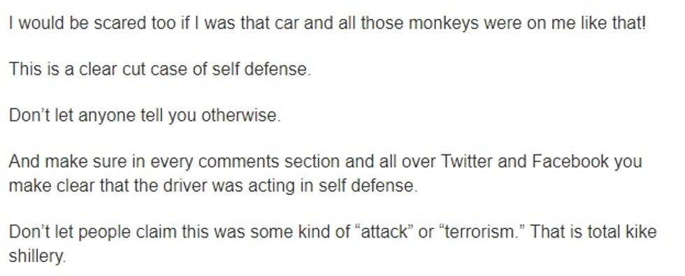 We know we shouldn't even give these morons the legitimacy of debunking them, but we're genuinely curious about how their minds work -- does Anglin think he's convincing anyone, perhaps just throwing shit at the wall and hoping one or two of his readers will take to Twitter to insist the car had been attacked first? Apparently, that actually is getting some mileage; more than one idiot on Twitter has posted another video making the claim; it's slowed down to show demonstrators attacking the car with a baseball bat -- after it had crashed into the crowd and two other vehicles. Not gonna embed; it's got gory shots of the aftermath of the attack. Somehow, we don't think "I was defending myself from the people hitting my car after I plowed into them" is going to fly in court.