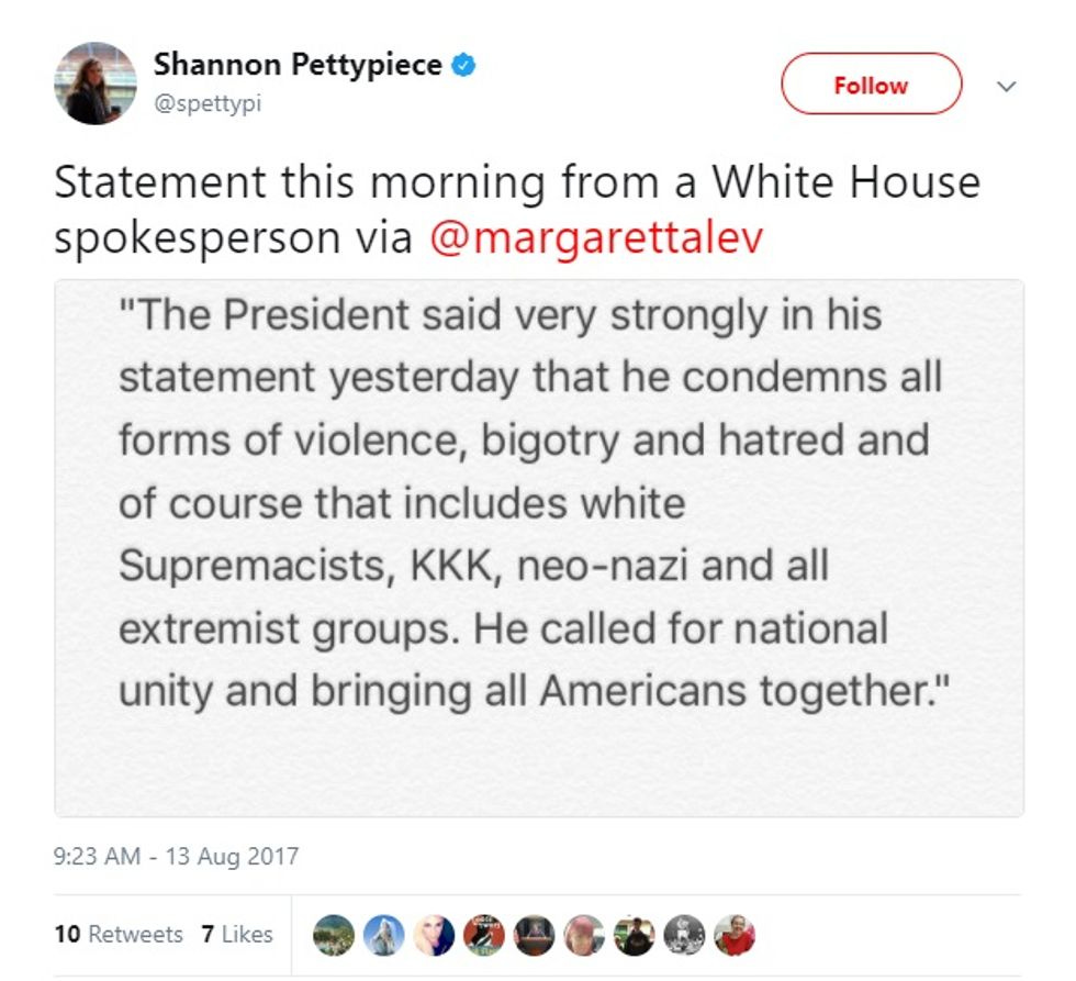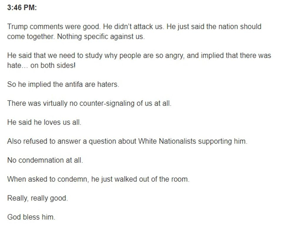 So there's your very specific condemnation. Jesus, are you people dense or what? Nicely done! It covers the "why no condemnation?" angle and allows white supremacists to say it was obviously released as cover by one of the cucks in the WH, but Trump remains on their side.